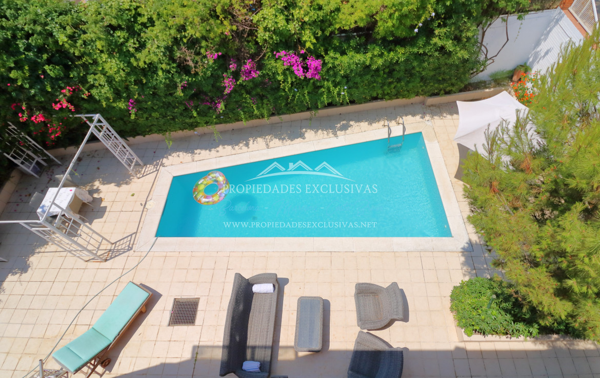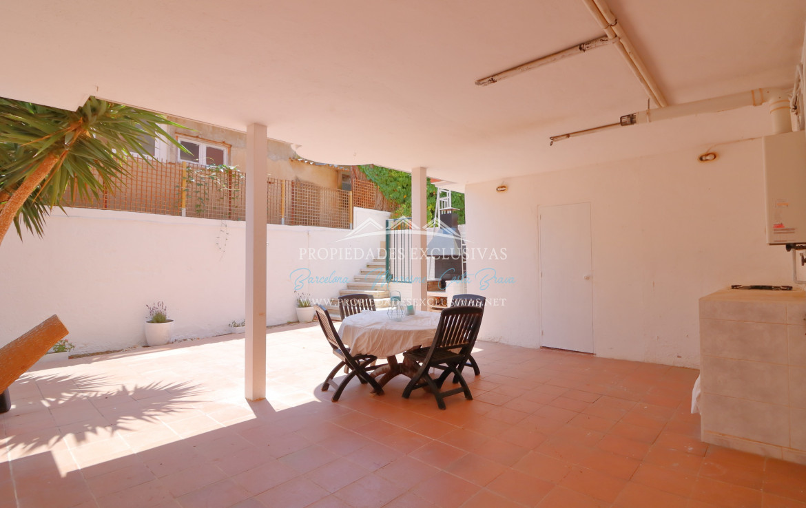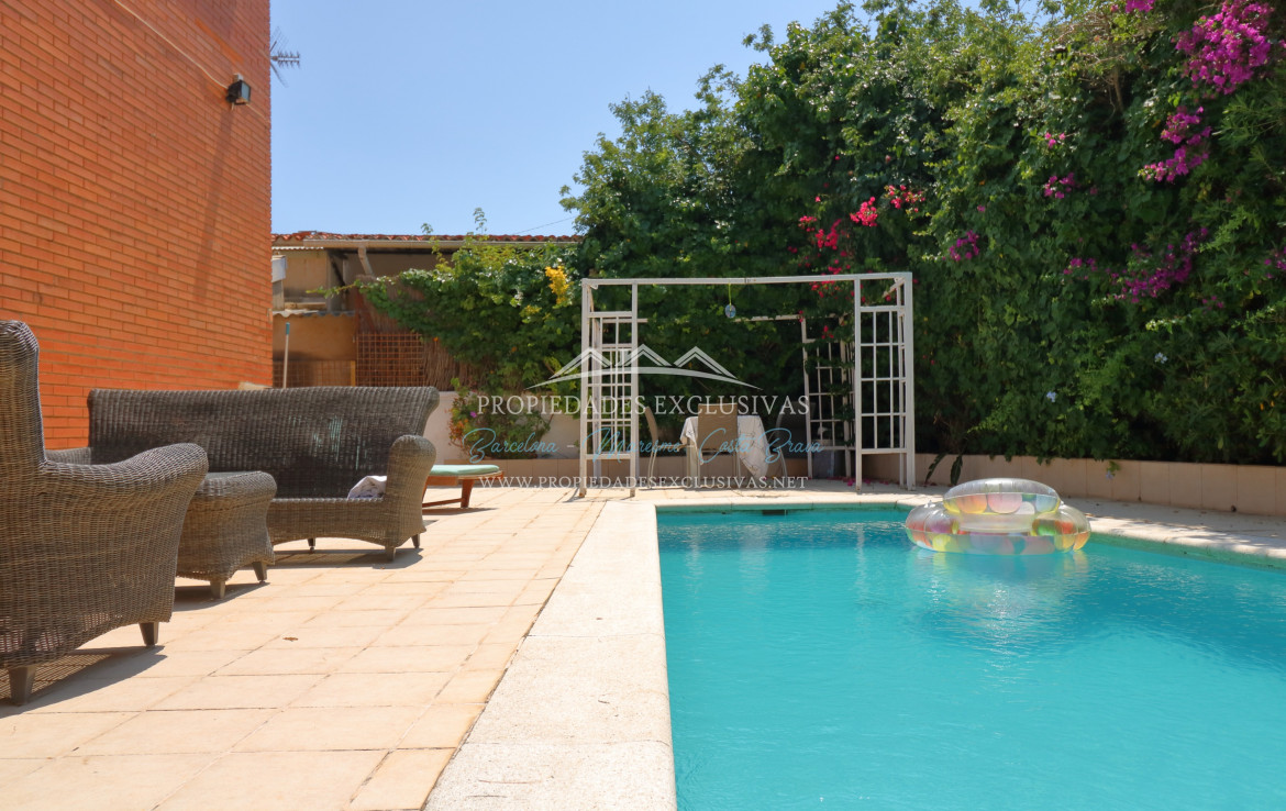 En la parte exterior encontramos la amplia piscina para disfrutar en familia con mucha privacidad y zona chill out o para tumbonas. También consta de barbacoa de obra y cocina exterior de gas con fogones y horno, con una zona de parking cubierta para hasta 3 coches, acceso directo a un baño completo con zona de lavadero para no tener que entrar en casa y escaleras interiores a la puerta principal de la casa.