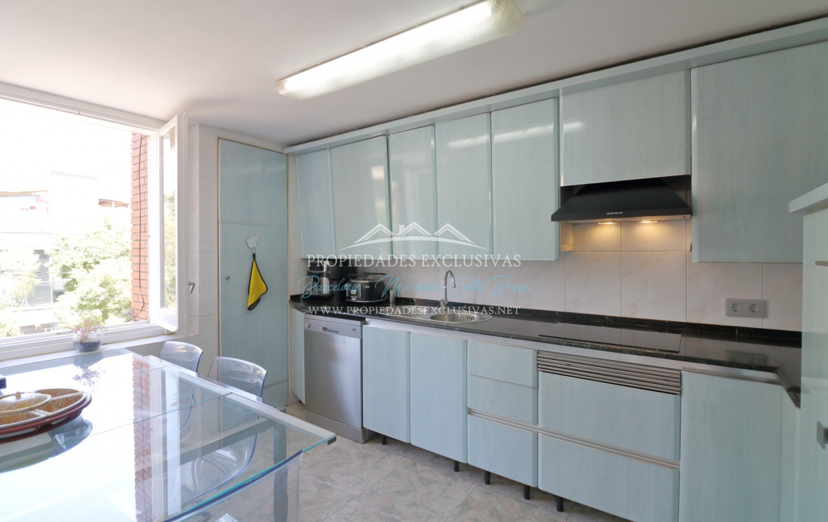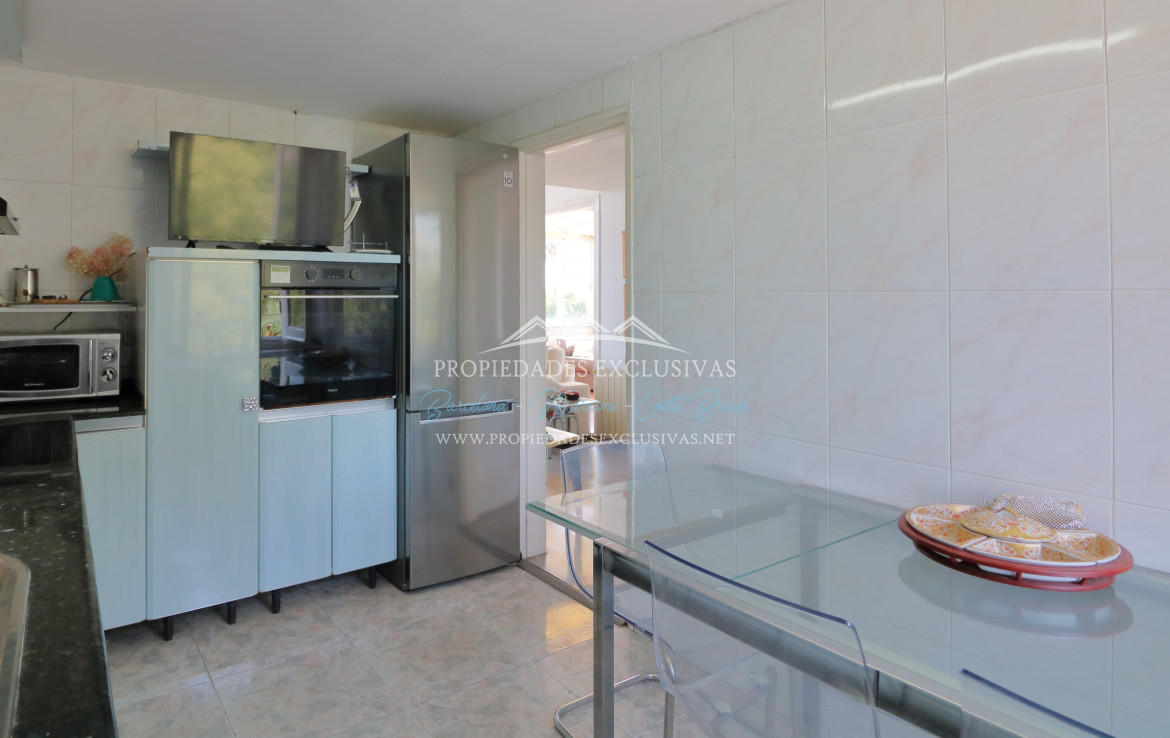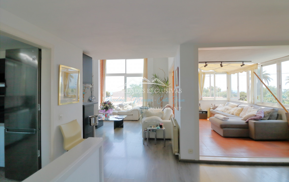 Subiendo las escaleras a la 1ra planta, encontramos una imponente zona de día, con un comedor para 10 personas, un amplio y luminoso salón abierto con una gran chimenea, vistas al mar desde todos los grandes ventanales, un cerramiento con techos de cristal que suma un acogedor espacio de salón aprovechable todo el año y la cocina que consta de electrodomésticos nuevos.