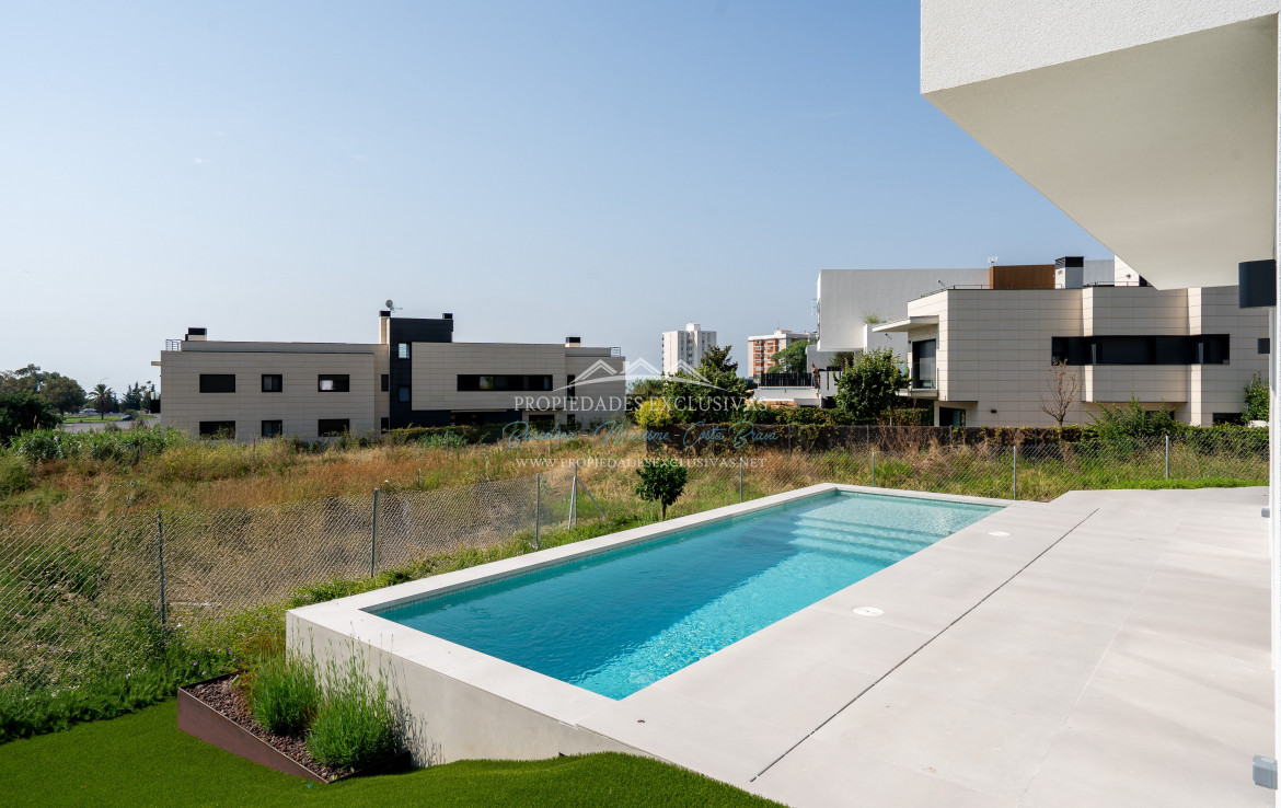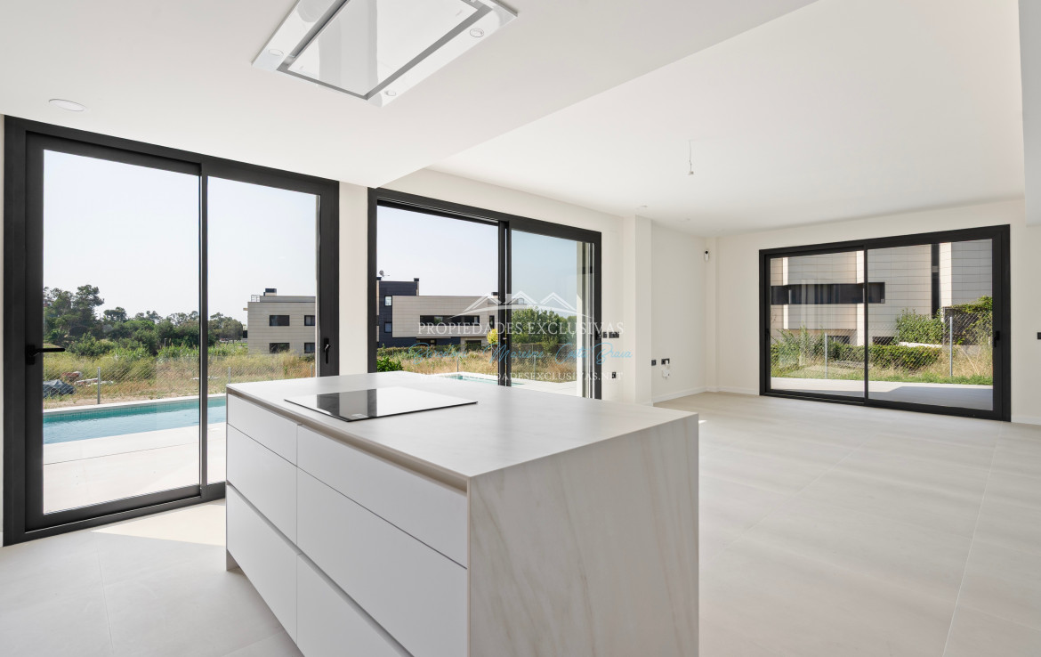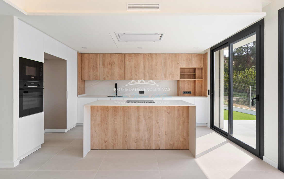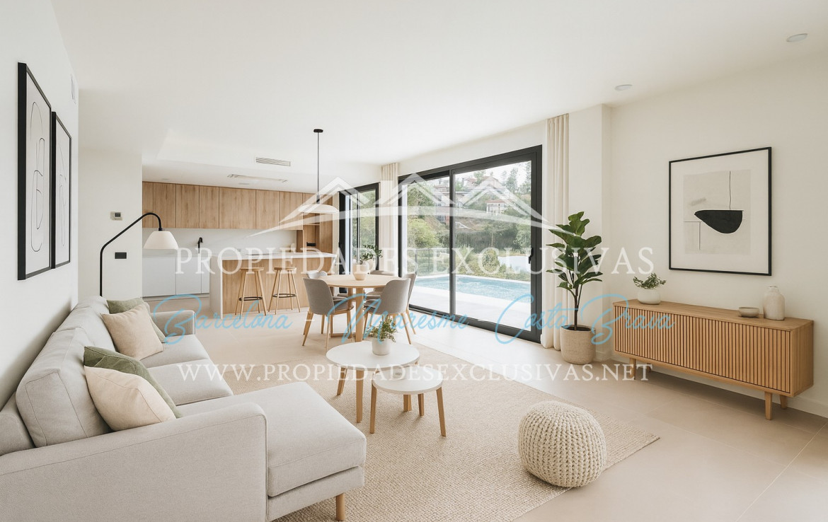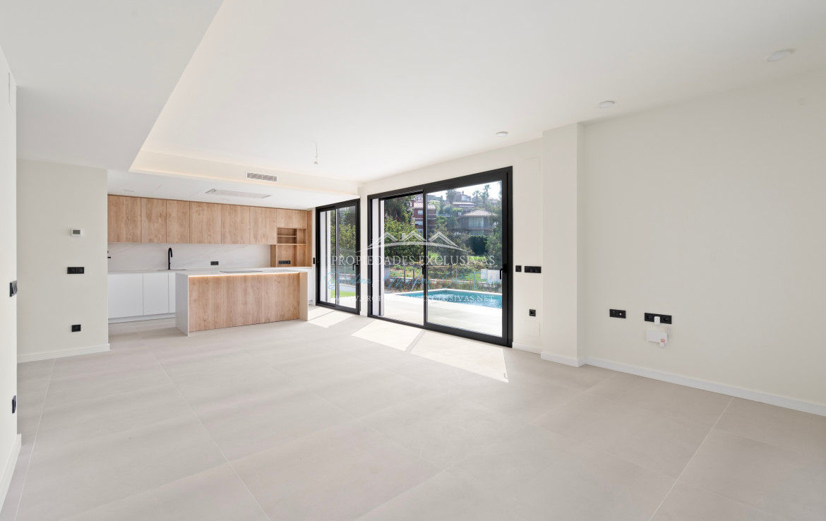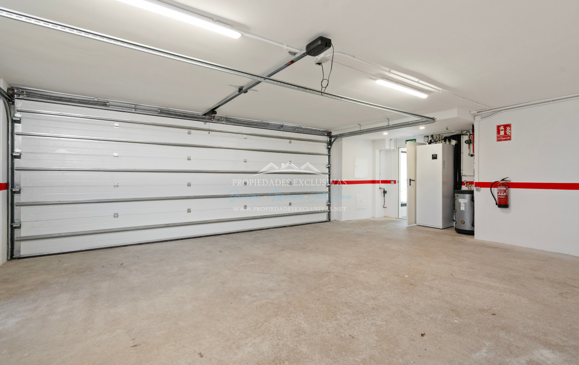 La planta principal se abre con un elegante salón-comedor con mucha luz natural gracias a sus grandes ventanales y orientación, que conectan directamente con un jardín privado y una piscina salina. La cocina, de diseño abierto y equipada con materiales de primera calidad, se convierte en el corazón del hogar, ideal para la vida familiar y social. En esta planta también encontramos un dormitorio doble, un baño completo, lavadero independiente y acceso directo al garaje con capacidad para dos coches y motos.